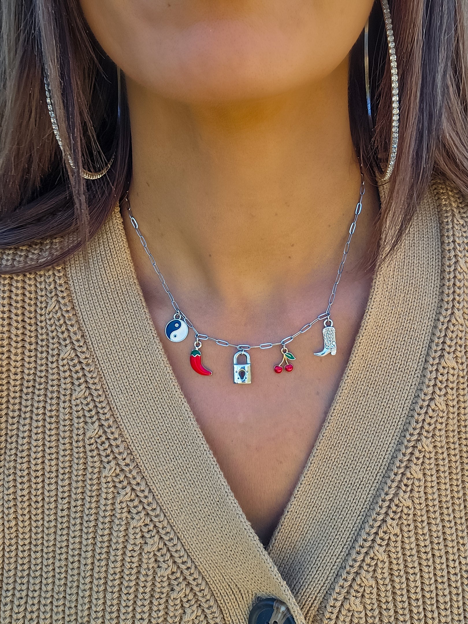 A little sweet, a little spicy, and whole lot of personality- this charm necklace has it all. Featuring a yin-yang for balance, a fiery chili pepper, a bold lock, playful cherries, and a sassy cowboy boot, it's basically your vibe in jewelry form. The perfect piece to add a touch of edge and whimsy to any fit!