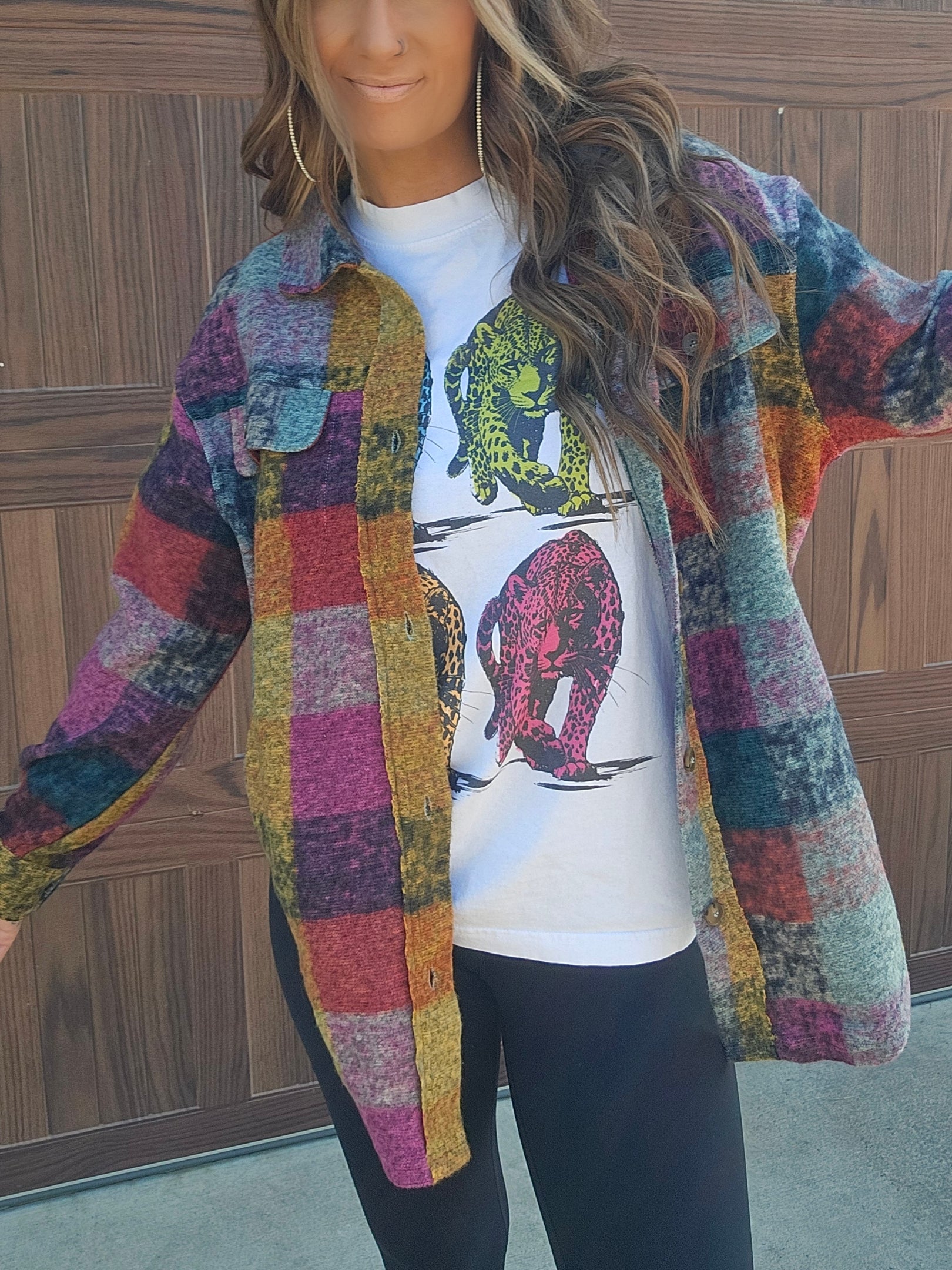 Make a bold statement in the Wild Pop Panther Tee- an over-sized graphic that brings major retro vibes with a pop-art twist. Featuring four fierce Panthers in electrifying neon tones, this tee is all about fearless energy and untamed style. Perfect for throwing on with biker shorts, denim, or layered under a jacket when you're feeling a little wild.