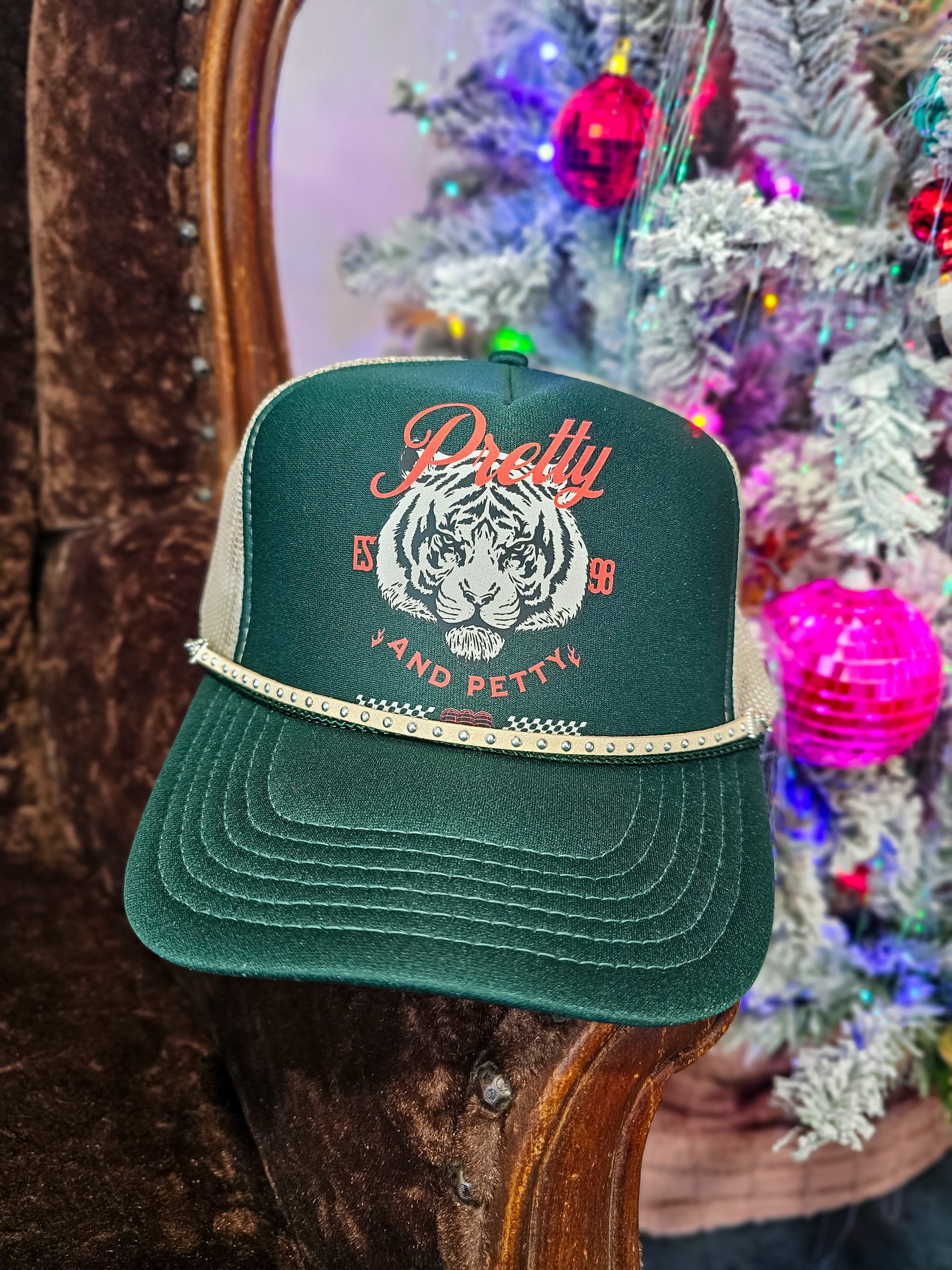 This green trucker hat is a real head-turner! It features a fierce white tiger with striking red eyes and mouth, making it super eye-catching. The text "Pretty and Petty" in bold red, along with "Est 98," adds a fun twist to the design. Plus, the gold chain and studs around the brim give it an extra touch of flair.
